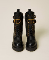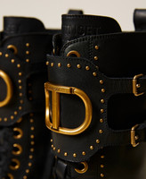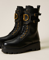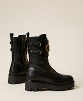 Leather combat boots with decorative rivets, central flap with side straps and macro Oval T logo at the centre.