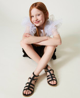 Miniature style and glamour with these girls’ leather cage sandals made in Italy with matching studs and tunit sole, fastened with straps. Comfortable and sophisticated, perfect for everyday outfits, on holiday and in the city.