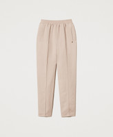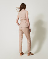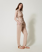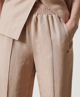 Viscose linen blend trousers with elasticated stitching at the waist, welt pockets, front seam detail, heart-shaped metal logo, cigarette fit.