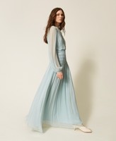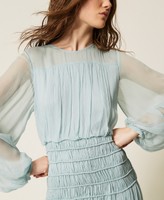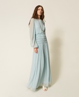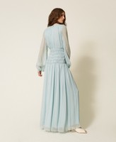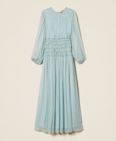 Long viscose crépon dress with raised motif that creates a gathered waistband. Round neck, gathered bodice, long sleeves, zip fastening at the back, loose fit.