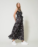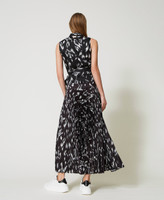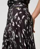 Long skirt made from printed crêpe de Chine with plain waistband and pleats below, side zip, unlined.