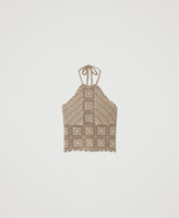 Fitted viscose blend knit top with multicolour lurex crochet work, halter neck with laces.