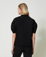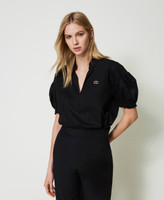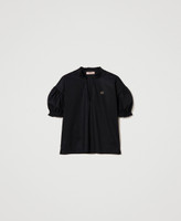 Stretch poplin blouse with band collar and V opening, short wide sleeves with gathering, rhinestone Oval T logo.