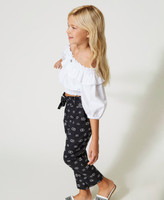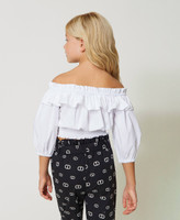 Stretch cotton cropped blouse, off-shoulder, with gathered flounce, three-quarter sleeves and elasticated hem.