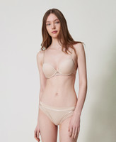 Microfibre and tulle push-up bra. Removable padding, see-through wings with satin-like elastic, straps made of plain elastic at the front and logo elastic at the back, heart-shaped metal logo plate between the cups.