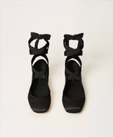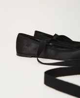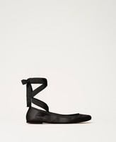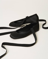 Satin ballerina shows with gros-grain laces and leather sole.