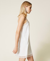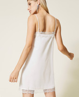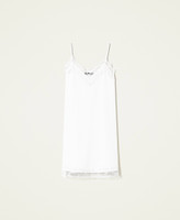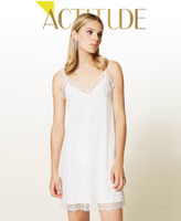 Actitude collection crêpe de chine slip dress with scalloped lace trim on V neck and hem, adjustable shoulder straps.
