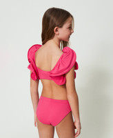 Bikini top with double ruffle on the shoulder straps and slight gathering on the front, bottom with bow on the front.
