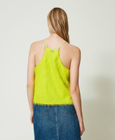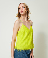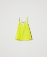 Light fabric top with floating feather-like threads, thin straps and inner lining.