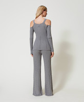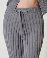Ribbed trousers made in Italy from Treeblend wool and viscose blend yarn with irregular cable knit pattern, drawstring at the waist, flared fit. The TREEBLEND project aims to reduce CO2 emissions during traditional knitwear production processes: 20% reduction expected. The yarn contains 50% recycled materials (PA and 50% of wool), the viscose is partially recovered from Twinset internal textile waste. No chemical solvents are used during the washing processes, thus reducing water consumption. Packaging is made entirely from recycled paper. This style is part of the capsule collection created in collaboration with Marco Rambaldi.
