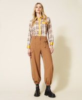 Viscose blend cargo trousers with belt loops and decorative ring, zip and button, elasticated ankles, loose fitting.