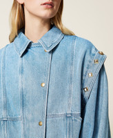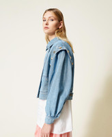 Twinset renews the denim jacket, with this new stone washed cotton denim style with slight colour drips on the stitching. Flap covered zip closure, dual garment effect gathered sleeves, stitching on the seams and pockets, cuffs, adjustable band at the hem with logo stud buttons. Extra style touch: rounded pyramid studs appliquéd by hand.
