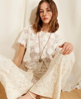 Cotton knit shirt with crochet-effect mesh stitch and floral pattern. Round neck, short wing sleeves, covered button fastening, scalloped trims, fitted.