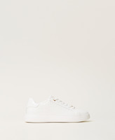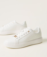 Total white leather trainers with all-over logo print, gold-tone details and rubber sole.