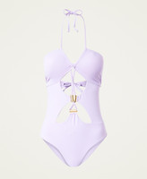 One-piece swimsuit with bandeau top and removable padding, cut-out, criss-crossed laces with zamak tubes.