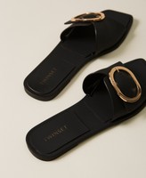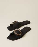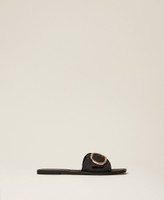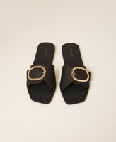 Rubber slide-on sandals with gold-tone metal logo buckle and flat sole.