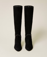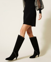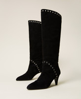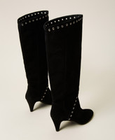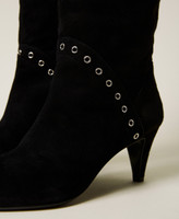 Suede boots with decorative metal eyelets and leather sole.