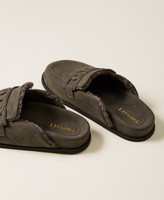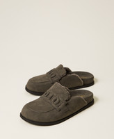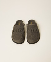 Faux suede mules with fur lining, tonal colour logo on the front, rubber sole.