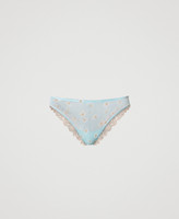Brazilian briefs made from tulle with daisy print all over, scalloped elastic at the waist, lace trim on the back.