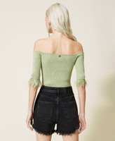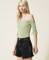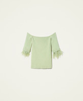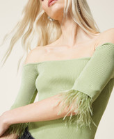 Actitude collection ribbed technical viscose fitted jumper with removable appliquéd feathers at the end of the sleeve.