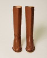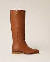 Leather boots with pipe leg, metal Oval T logo, leather sole.