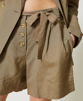 Viscose and linen blend shorts with buttons, front pleats, slant pockets, removable webbing belt.