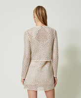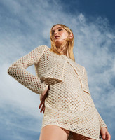 Complete your sophisticated looks with this short jacket made from loom mesh with weaved cordonnet threads, enhanced with faceted sequin and bead embroidery, lining. The technique used to craft this material has crochet-like weaved threads instead of seams on sides, armhole and neckline. Straight fit, round neck, long sleeves, invisible metal hook closure and no lining. Wear it with its matching dress for a special occasion.