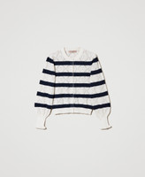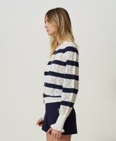 Two-tone cotton and cashmere cardigan with openwork Oval T all over, round neck and long sleeves.