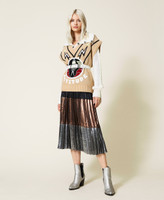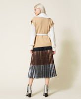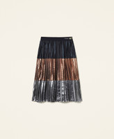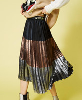 Inlaid colour blocks for this pleated laminated georgette midi skirt in three colours with visible elastic and logo on the side, lining. Complete it with pull and trainers.