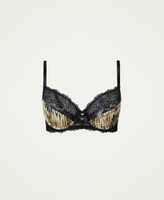 Non-padded underwire bra made of animal print stretch satin with contrasting lace insert.