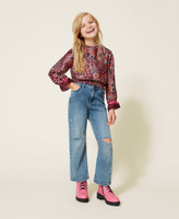 A multitasking pair of Girls' jeans that is so easy to match. Made from stone washed denim, with rips, scratches, belt loops, snap button and zip, five pockets. Use them for school, playtime and leisure.