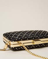 Rigid clutch bag with mixed studs appliqued over a diamond grid, pop-up shoulder strap and gold tone tassel.