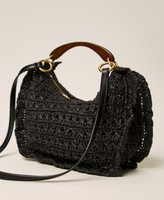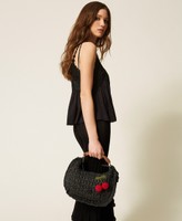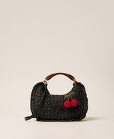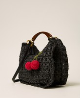 Croissant hobo bag made by hand from cellulose raffia with flounce along the edges. With dyed natural wood handle, removable faux calfskin leather cross-body strap, zip closure, lining, hand-stitched label with heat-printed logo. Customised with three-dimensional cotton crochet cherries.