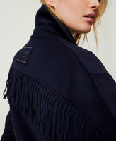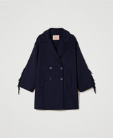Doubled wool blend coat with rear yoke and tonal torchon fringes on the sleeves.