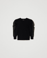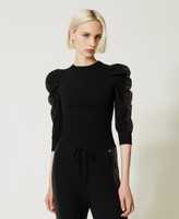 New volumes for the fitted jumper made from modal blend yarn, with gathered puffed sleeves and micro stud appliqués. Fitted, round neck, long sleeves with ribbed cuffs. Wear it with its matching trousers or mix it up.