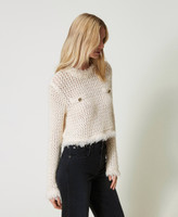 Jacquard mesh jumper with fringed trim, round neck, long sleeves, welt pocket effect with metal Oval T buttons with logo, regular fit.