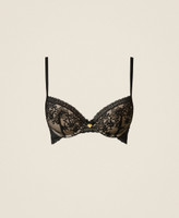 Lace push-up bra with floral pattern. Underwired with removable cups, matching microfibre sides, covered shoulder straps at the front and adjustable logoed elastic at the back, two-hook fastening, organza bow and heart-shaped metal logo between the cups.