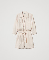 Linen-viscose blend jumpsuit with an elasticated waist and fabric drawstring to tie centre-front. Featuring a shirt collar, V-neck, yoke, logoed button fastening, chest pockets with flap and buttons, three-quarter sleeves with dropped shoulders, buttoned cuffs, patch pockets on the lower section, a heart-shaped metal logo on the back and a loose fit.