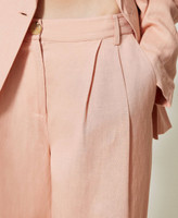 Viscose and linen blend trousers with front pleats, folded hem with frog fastener on the side, wide fit.