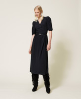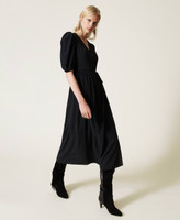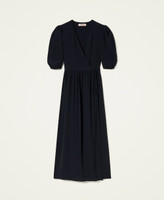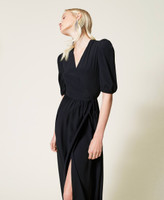 Long dress made of silk blend crêpe de Chine with wrap-around closure, V neck, gathered sleeves.