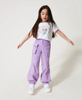 Girls' cotton poplin cargo trousers with belt loops, zip and button fastening, elasticated waist at the back and elasticated hem, patch pockets, loose fit.