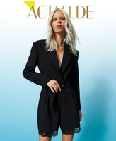 Robe-manteau inspiration for this short jumpsuit made from technical fabric with long sleeves and lapels, zip and hidden snap button closure, shorts with macramé lace at the hem, lining. Define the waistline with fabric-covered buckle belt.