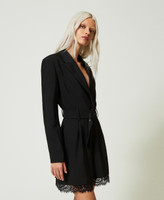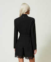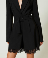 Actitude collection short jumpsuit made from technical fabric with macramé lace at the hem, zip and snap button closure, matching belt.