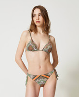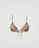 Non-padded triangle bikini top with scarf print, rhinestones, tie-up lace closure.
