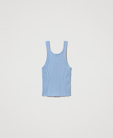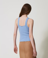 Viscose blend rib knit top with crew neck, wide shoulder straps, logo plate on the back. Fitted.