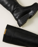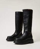 High drainpipe leg boots with logo plate at the opening, rubber lug sole.