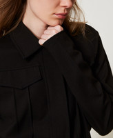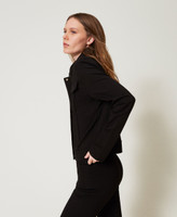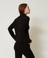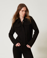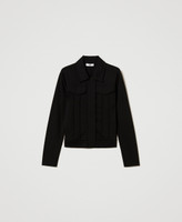 Milano stitch jacket with shirt collar, concealed metal zip and snap button fastening, long sleeves, yoke seam with mock pocket flaps and front ribbing. Logo plate on the back, straight fit, unlined.