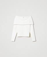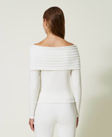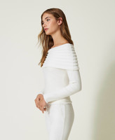 Jumper with large, fold-over neck and alternate stripes of viscose blend and soft yarn, long sleeves.
