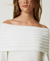 Capture all the attention with this long sleeve jumper made from plain knit viscose blend jumper with maxi neck that can folded off the shoulder. Features a striped pattern with fur stitch alternating with viscose blend. Complete it with the matching skirts and show off a new kind of total knit look.