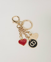 Metal keyring with carabiner, and three logo charms in different colours and shapes.